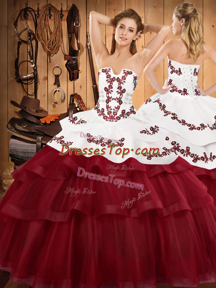 Free and Easy Wine Red Strapless Lace Up Embroidery and Ruffled Layers Quince Ball Gowns Sweep Train Sleeveless