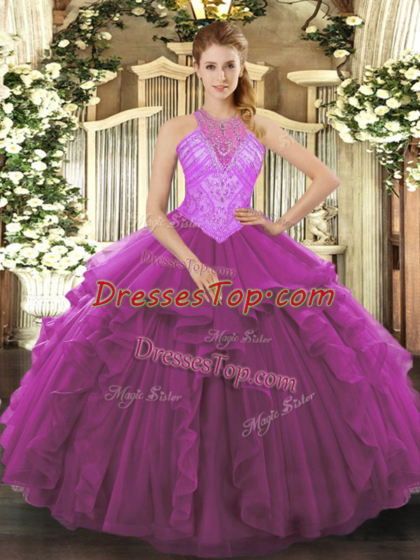 Fuchsia 15 Quinceanera Dress Military Ball and Sweet 16 and Quinceanera with Beading and Ruffles High-neck Sleeveless Lace Up