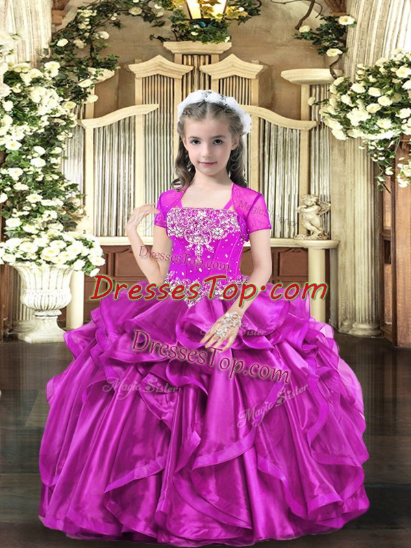 Fuchsia Ball Gowns Beading and Ruffles Little Girls Pageant Dress Lace Up Organza Sleeveless Floor Length