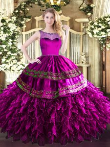 Fuchsia Ball Gowns Beading and Ruffles Quince Ball Gowns Zipper Organza and Taffeta Sleeveless Floor Length