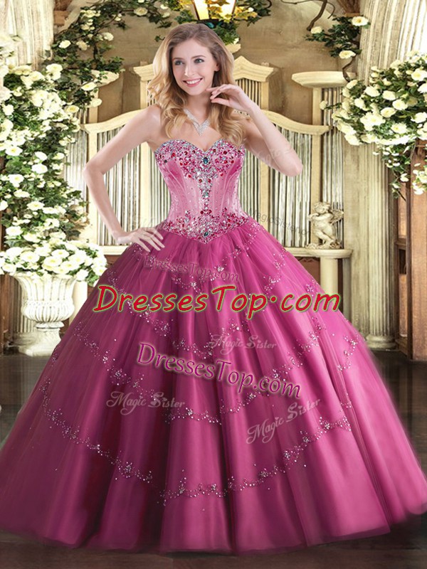 Fuchsia Ball Gowns Beading Quinceanera Gowns Lace Up Tulle Sleeveless Floor Length
