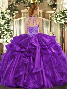 Fuchsia Ball Gowns Organza Halter Top Sleeveless Beading and Embroidery and Ruffles Floor Length Lace Up Quinceanera Gown