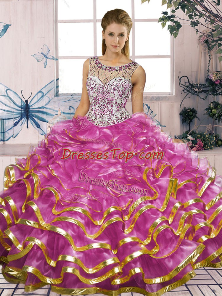 Fuchsia Ball Gowns Organza Scoop Sleeveless Beading and Ruffles Floor Length Lace Up Ball Gown Prom Dress