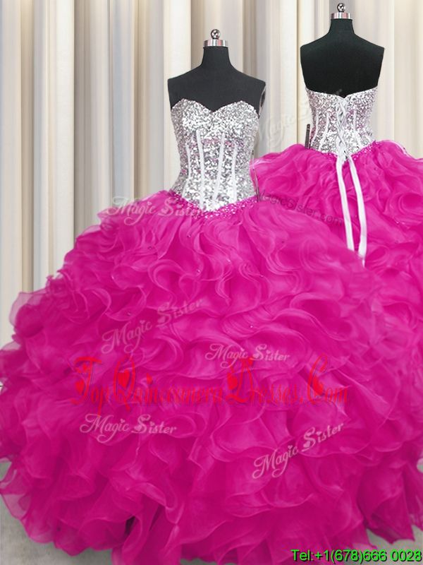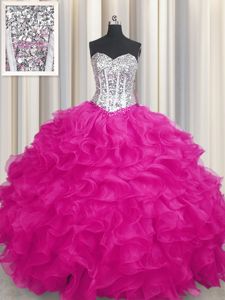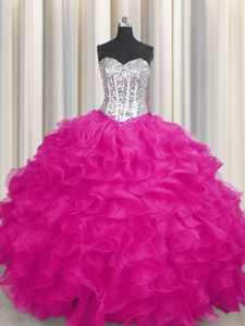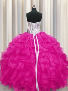 Fuchsia Ball Gowns Organza Sweetheart Sleeveless Beading and Ruffles Lace Up Quinceanera Gown