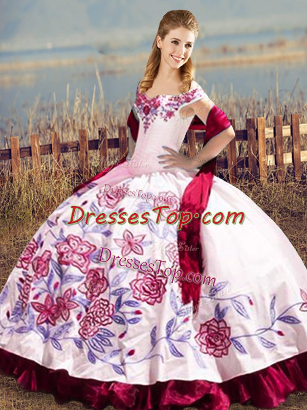 Fuchsia Ball Gowns Satin and Organza Off The Shoulder Sleeveless Embroidery Floor Length Lace Up Vestidos de Quinceanera