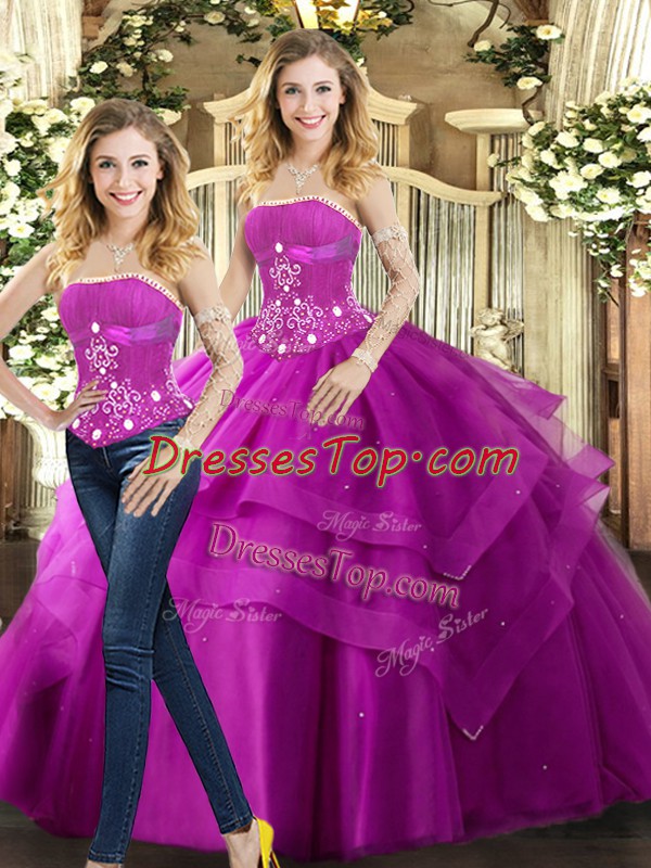 Fuchsia Ball Gowns Strapless Sleeveless Tulle Floor Length Lace Up Beading and Ruffles 15 Quinceanera Dress