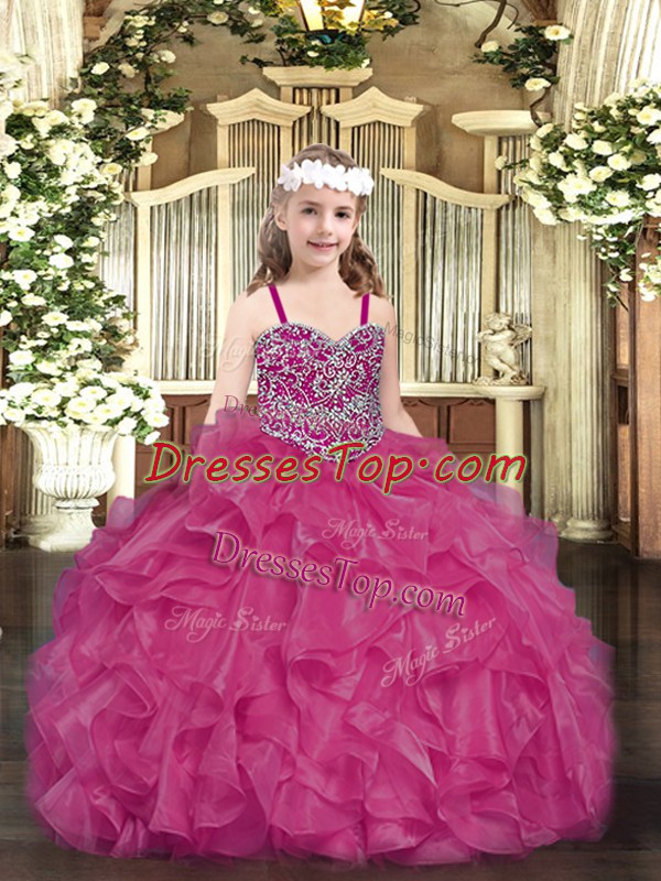 Fuchsia Ball Gowns Straps Sleeveless Organza Floor Length Lace Up Beading and Ruffles Little Girls Pageant Dress