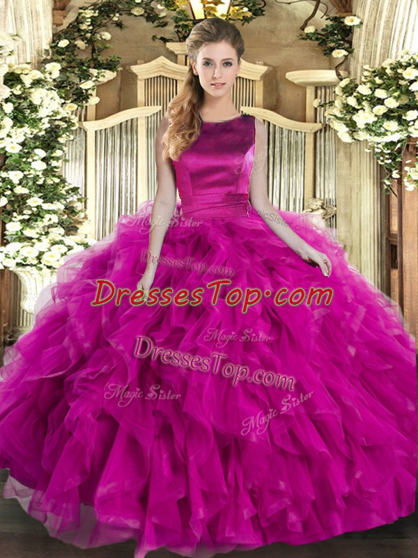 Fuchsia Ball Gowns Tulle Scoop Sleeveless Ruffles Floor Length Lace Up Sweet 16 Dress