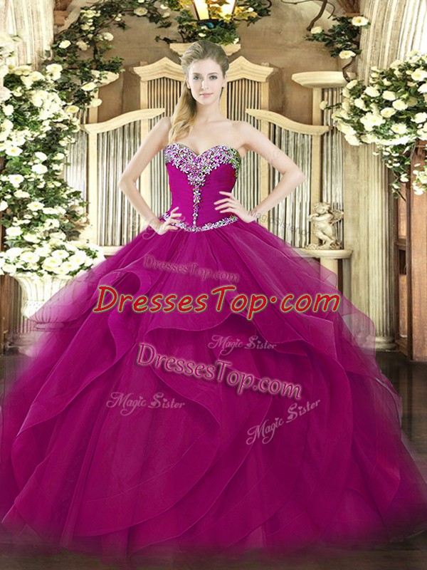 Fuchsia Ball Gowns Tulle Sweetheart Sleeveless Beading and Ruffles Floor Length Lace Up Sweet 16 Quinceanera Dress