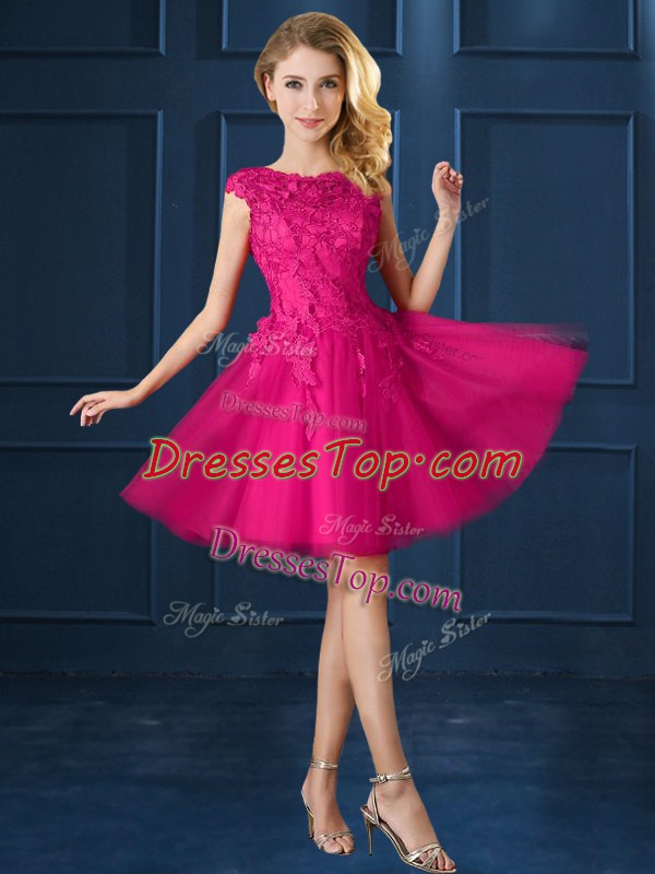 Fuchsia Bateau Lace Up Lace and Belt Quinceanera Dama Dress Cap Sleeves
