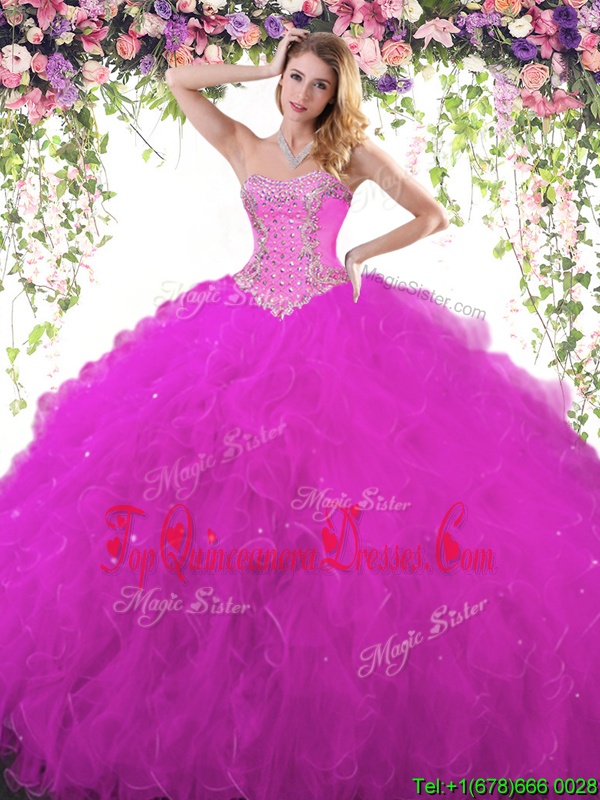 Fuchsia Lace Up Ball Gown Prom Dress Beading Sleeveless Floor Length