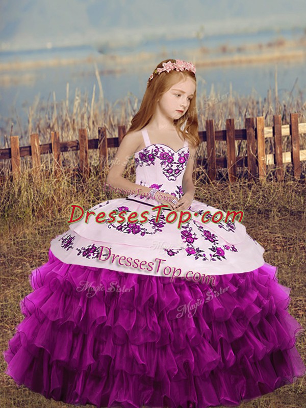 Fuchsia Lace Up Child Pageant Dress Embroidery and Ruffled Layers and Bowknot Sleeveless Floor Length