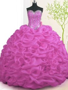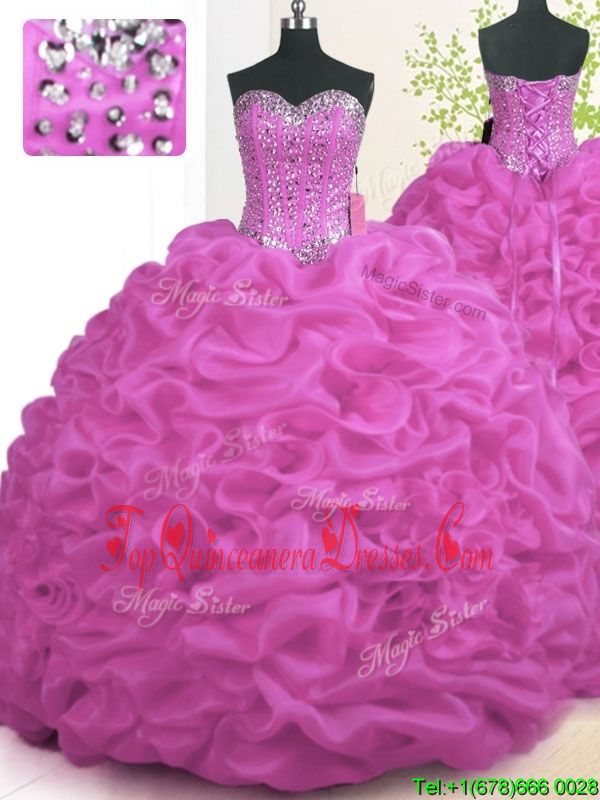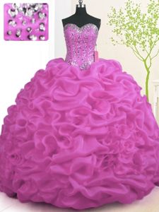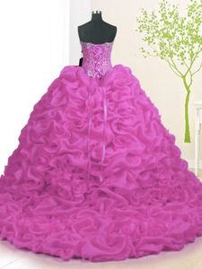 Fuchsia Lace Up Sweet 16 Dresses Beading and Ruffles Sleeveless With Brush Train