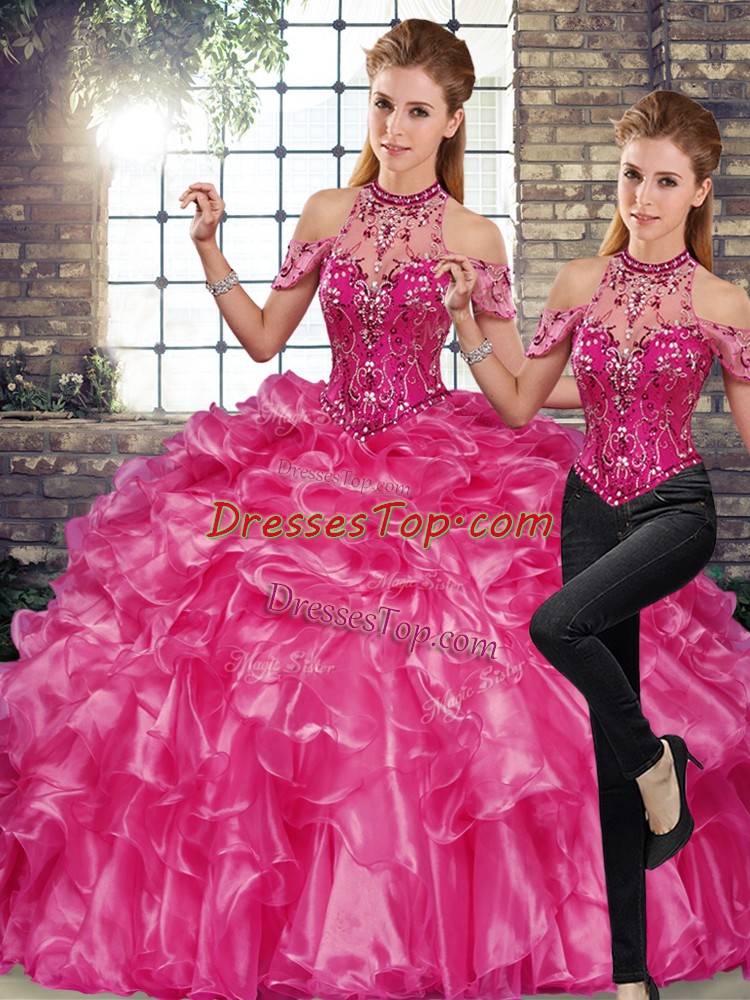 Fuchsia Organza Lace Up Halter Top Sleeveless Floor Length 15th Birthday Dress Beading and Ruffles