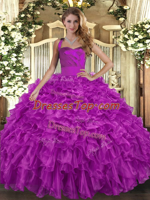 Fuchsia Organza Lace Up Halter Top Sleeveless Floor Length 15th Birthday Dress Ruffles