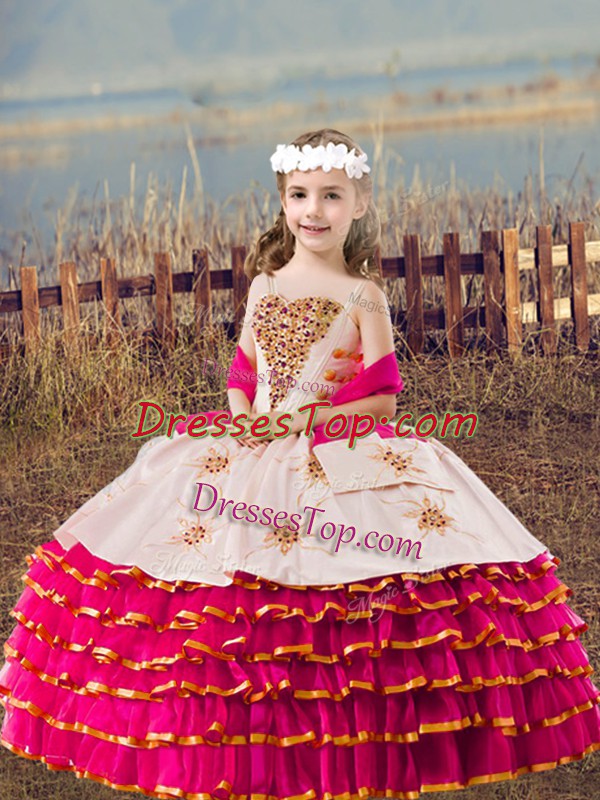 Fuchsia Organza Lace Up Little Girls Pageant Dress Wholesale Sleeveless Floor Length Beading and Embroidery and Ruffled Layers