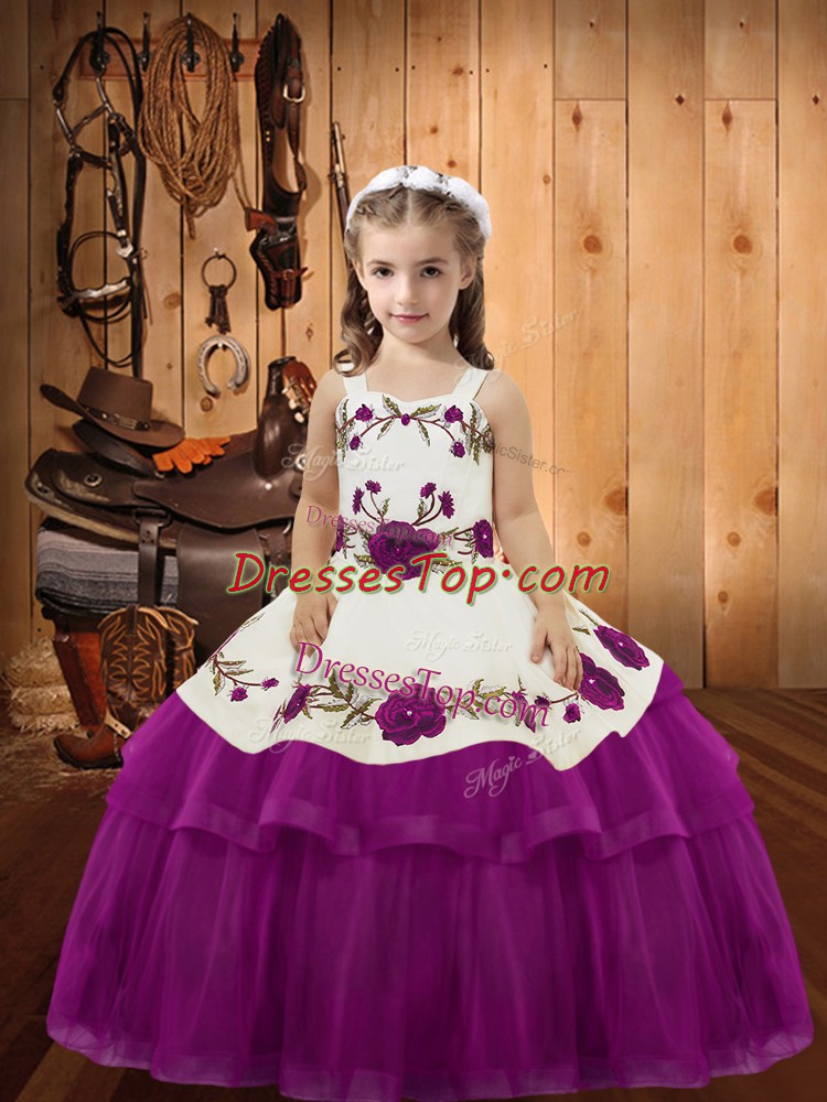 Fuchsia Organza Lace Up Little Girls Pageant Dress Wholesale Sleeveless Floor Length Embroidery and Ruffled Layers