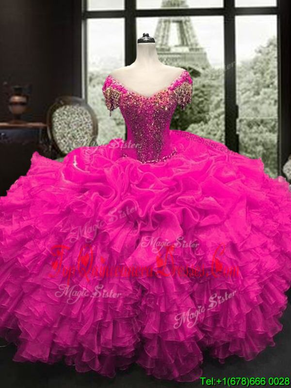 Fuchsia Organza Lace Up Quince Ball Gowns Cap Sleeves Floor Length Beading and Ruffles