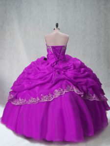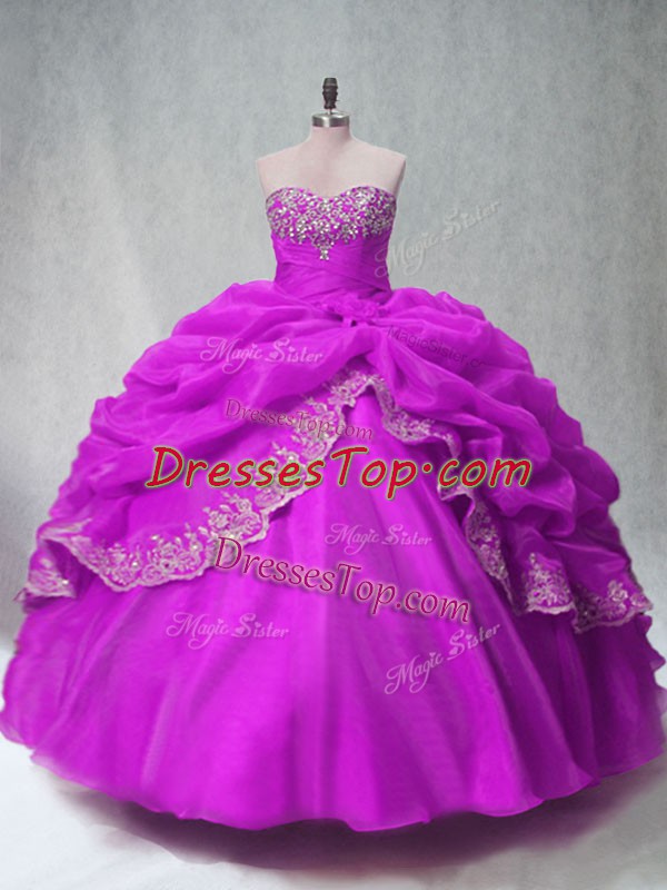 Fuchsia Organza Lace Up Quinceanera Dress Sleeveless Floor Length Beading and Appliques
