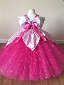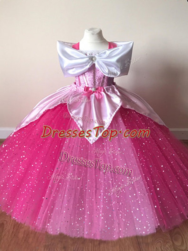 Fuchsia Short Sleeves Floor Length Sequins Zipper Little Girl Pageant Dress