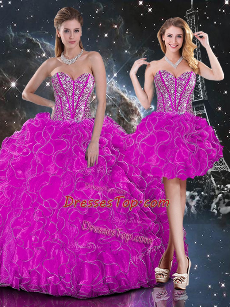 Fuchsia Sleeveless Beading and Ruffles Floor Length Ball Gown Prom Dress