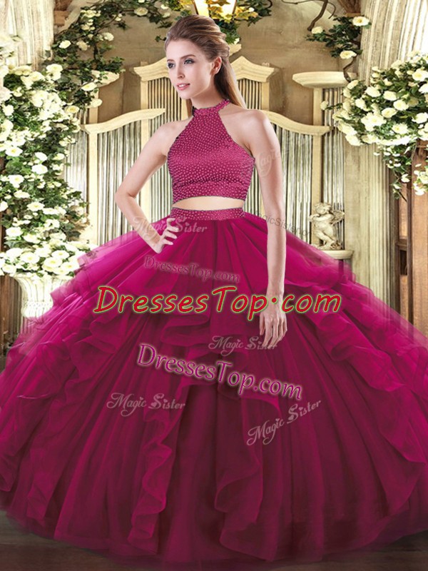 Fuchsia Sleeveless Beading and Ruffles Floor Length Vestidos de Quinceanera