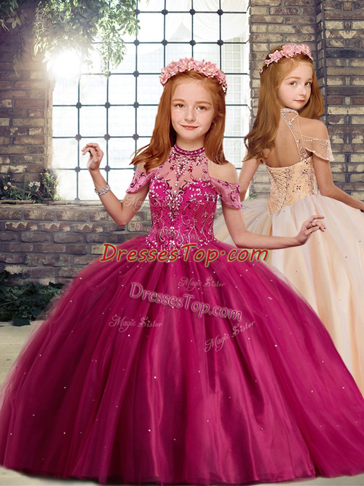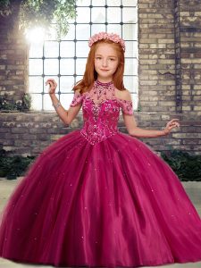 Fuchsia Sleeveless Beading Floor Length Little Girls Pageant Gowns