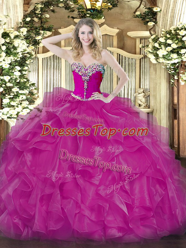 Fuchsia Sleeveless Organza Lace Up Quince Ball Gowns for Military Ball and Sweet 16 and Quinceanera