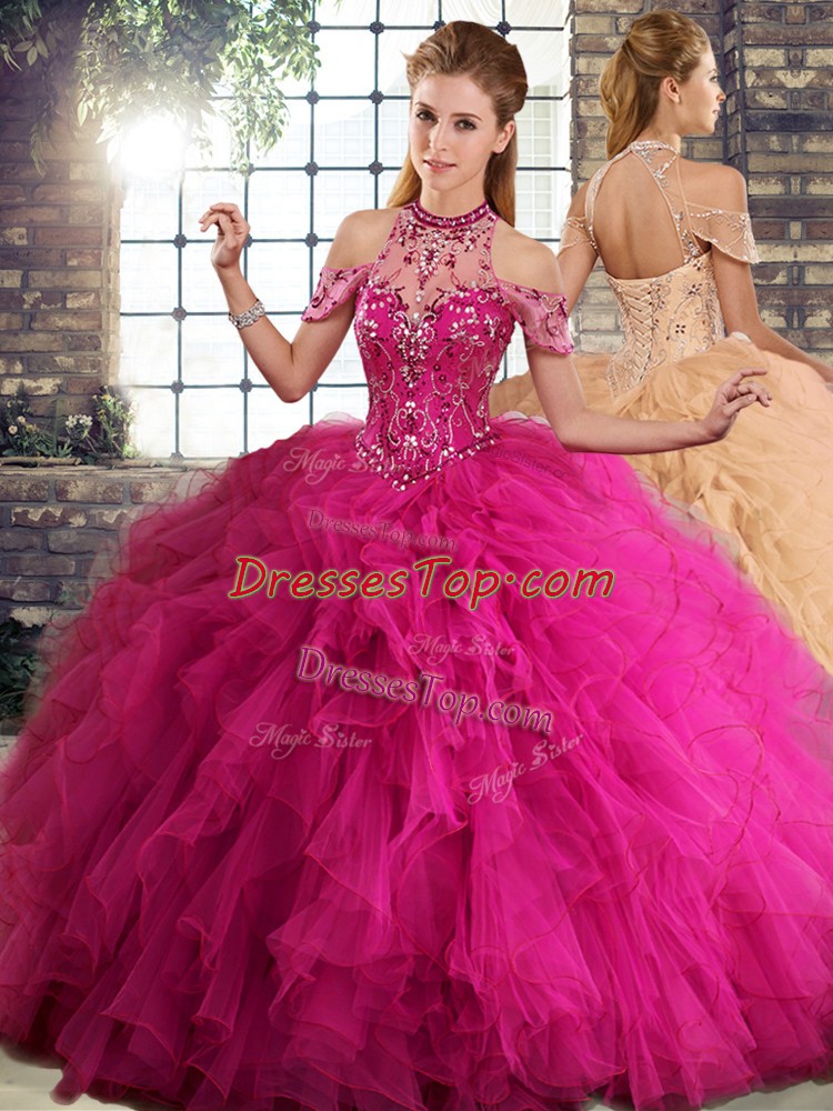 Fuchsia Sleeveless Tulle Lace Up Quinceanera Gowns for Military Ball and Sweet 16 and Quinceanera