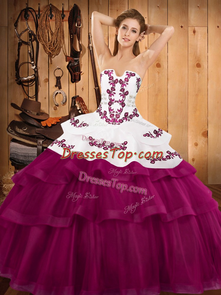 Fuchsia Strapless Lace Up Embroidery and Ruffled Layers Quinceanera Dress Sweep Train Sleeveless