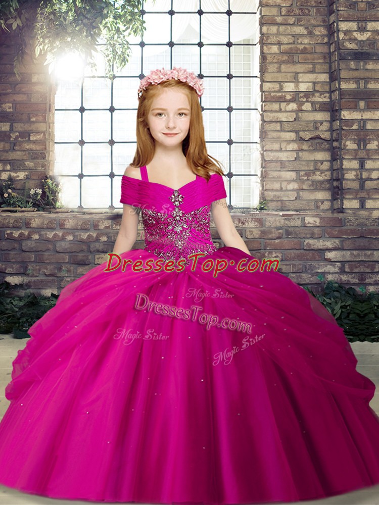 Fuchsia Straps Lace Up Beading Little Girls Pageant Gowns Sleeveless