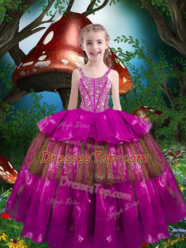 Fuchsia Straps Neckline Beading and Ruffled Layers Pageant Dress for Womens Sleeveless Lace Up