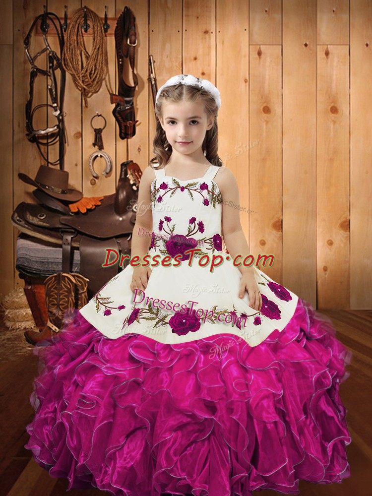 Fuchsia Straps Neckline Embroidery and Ruffles Pageant Gowns For Girls Sleeveless Lace Up