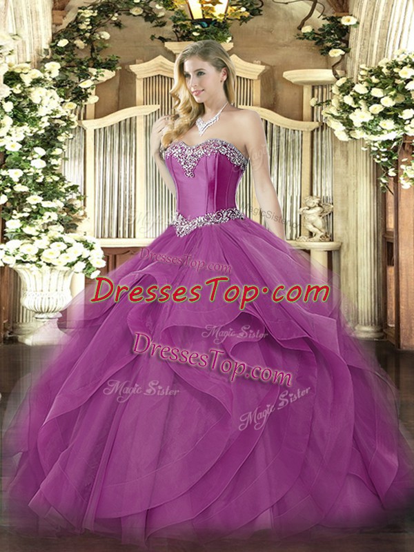Fuchsia Tulle Lace Up Quince Ball Gowns Sleeveless Floor Length Beading and Ruffles