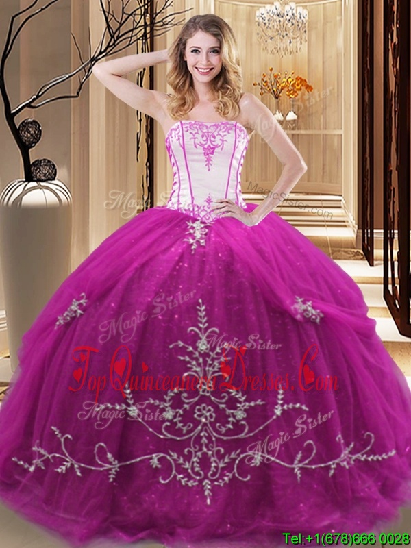 Fuchsia Tulle Lace Up Strapless Sleeveless Floor Length Vestidos de Quinceanera Embroidery
