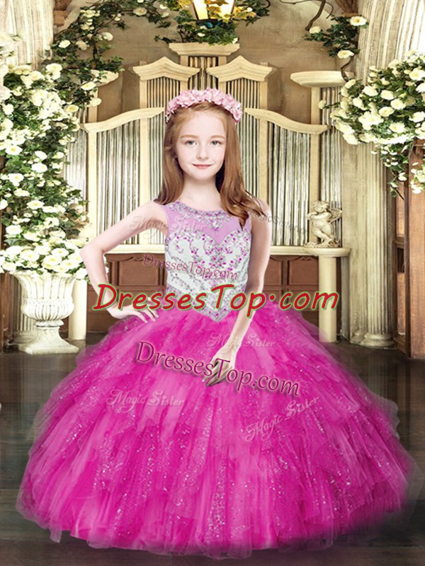 Fuchsia Tulle Zipper Scoop Sleeveless Floor Length Girls Pageant Dresses Beading and Ruffles