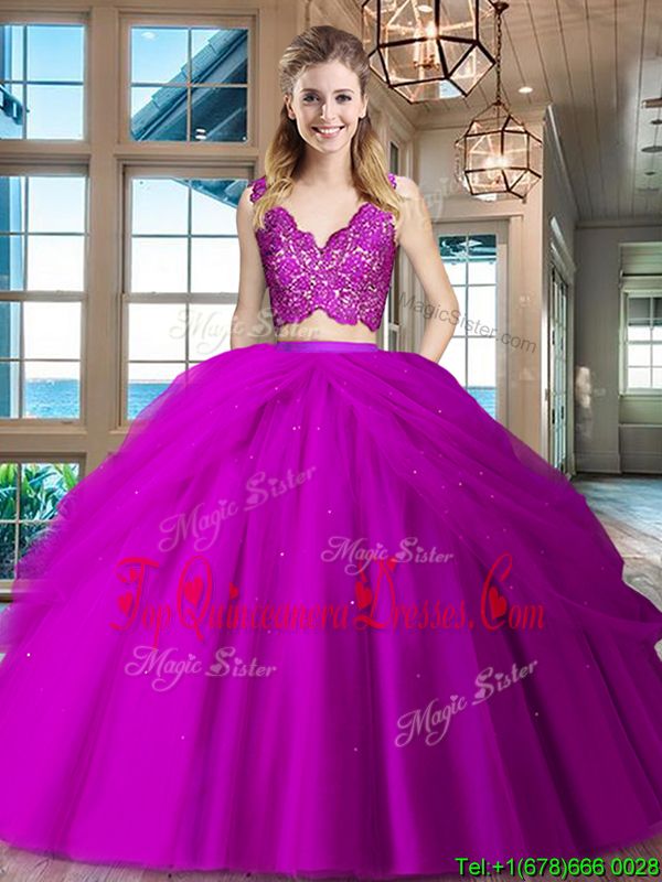 Fuchsia Tulle Zipper V-neck Sleeveless Floor Length Vestidos de Quinceanera Lace and Ruffled Layers