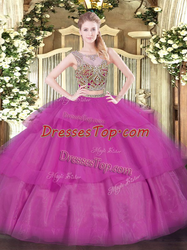 Fuchsia Two Pieces Beading and Ruffled Layers Sweet 16 Dress Lace Up Tulle Sleeveless Floor Length