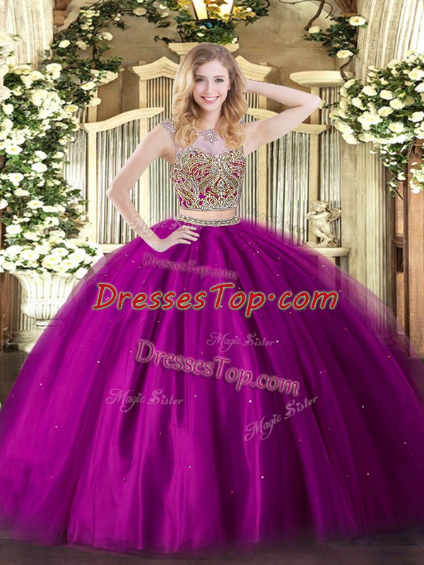 Fuchsia Two Pieces Beading Quinceanera Dress Lace Up Tulle Sleeveless Floor Length