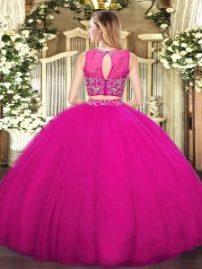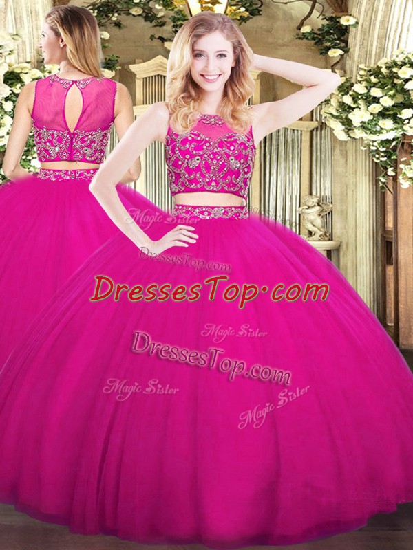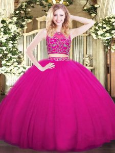 Fuchsia Two Pieces High-neck Sleeveless Tulle Floor Length Zipper Beading Quinceanera Dress