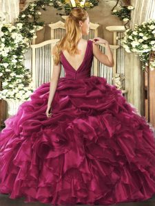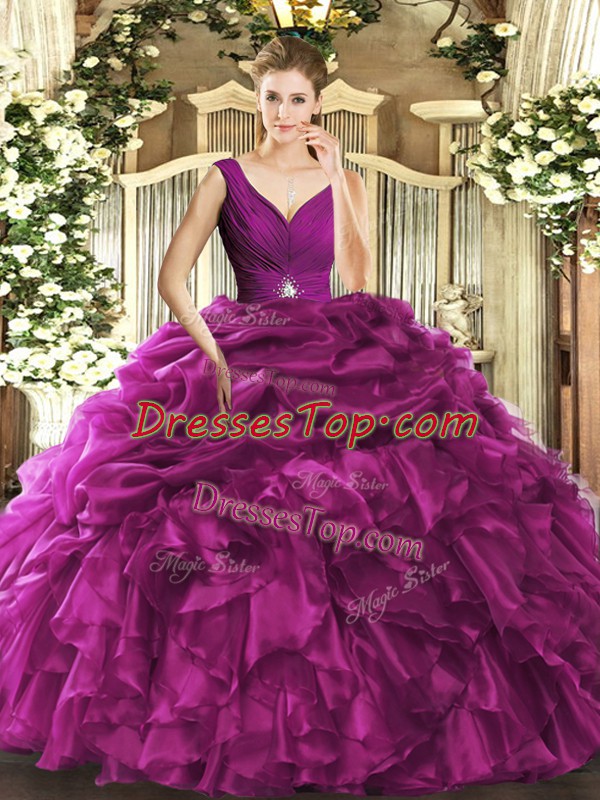 Fuchsia V-neck Backless Beading and Ruffles Quinceanera Dress Sleeveless