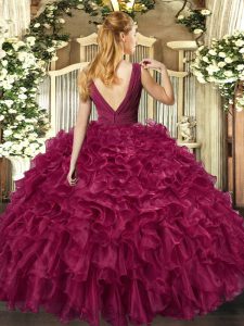 Fuchsia V-neck Backless Beading and Ruffles Sweet 16 Dresses Sleeveless