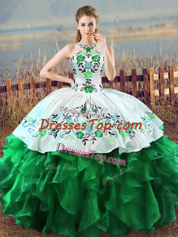 Glamorous Green Ball Gowns Halter Top Sleeveless Organza Floor Length Lace Up Embroidery and Ruffles Quinceanera Gown