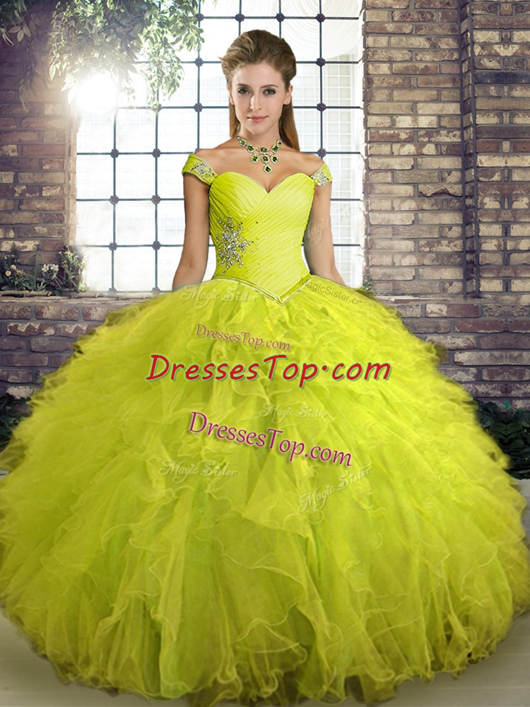 Glamorous Off The Shoulder Sleeveless Sweet 16 Dress Floor Length Beading and Ruffles Yellow Green Tulle