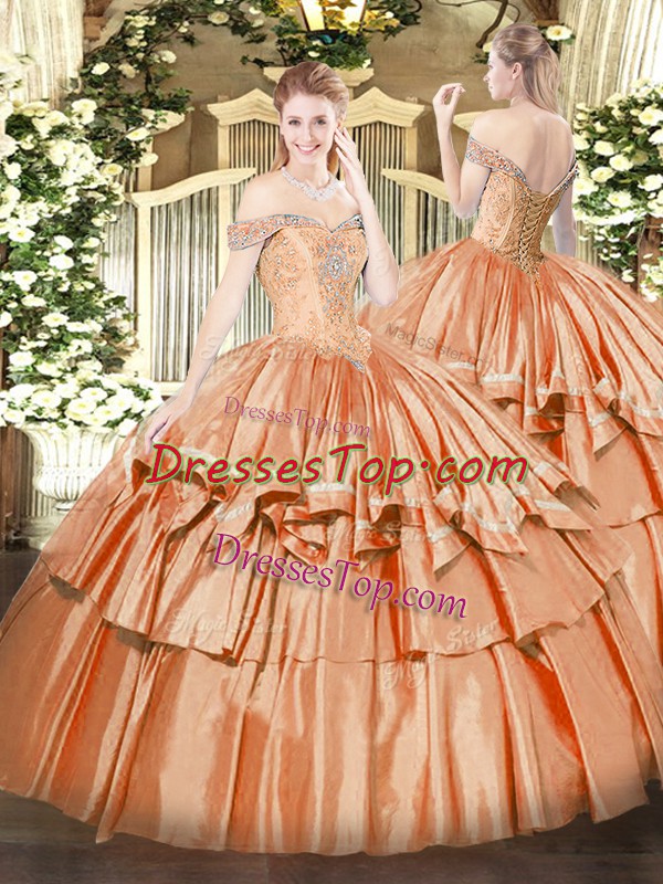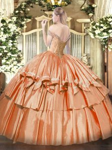 Glamorous Orange Red Organza Lace Up Off The Shoulder Sleeveless Floor Length 15th Birthday Dress Beading and Ruffled Layers