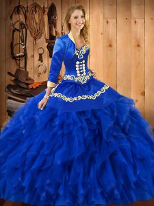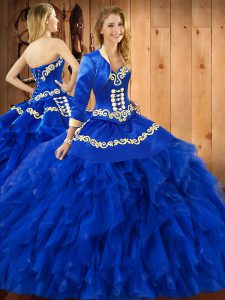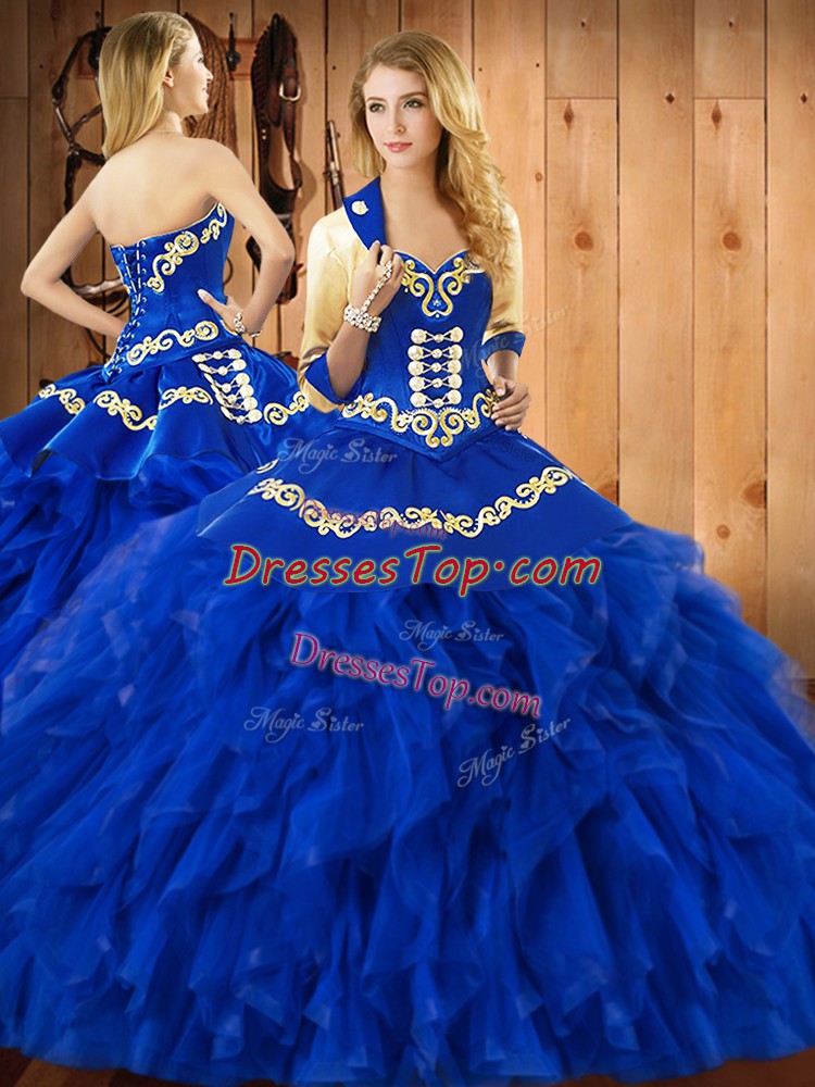Glamorous Sleeveless Satin and Organza Floor Length Lace Up Quinceanera Gowns in Blue with Embroidery and Ruffles