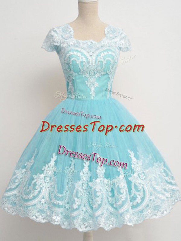 Glittering Aqua Blue A-line Square Cap Sleeves Tulle Knee Length Zipper Lace Quinceanera Court Dresses