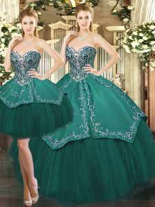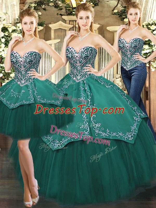 Glittering Floor Length Lace Up Quinceanera Dress Dark Green for Military Ball and Sweet 16 and Quinceanera with Beading and Appliques