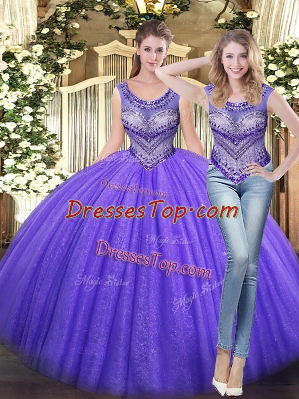 Glittering Lavender Ball Gowns Beading Sweet 16 Dress Lace Up Tulle Sleeveless Floor Length