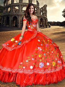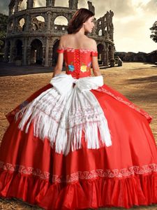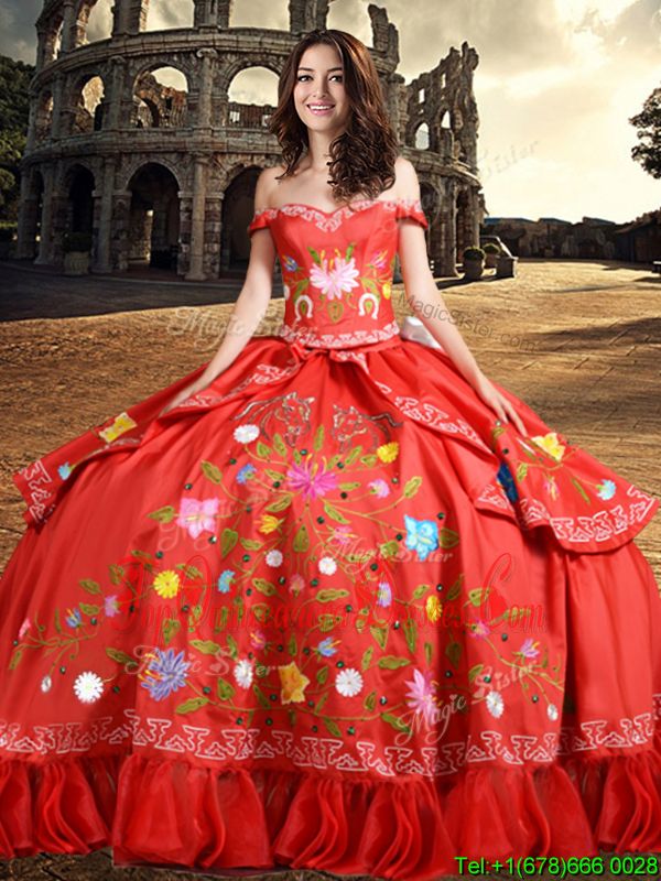 Glittering Off the Shoulder Red Sleeveless Floor Length Embroidery and Bowknot Lace Up Ball Gown Prom Dress